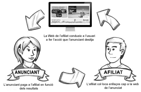 Imaginem a un anunciant que té una pàgina web per fer difusió i vendre els seus productes i serveis. Els possibles clients poden arribar a la seva pàgina per diferents vies: les pròpies, -de la seva web- i les externes, -suports d'altres empreses o professionals que tenen un volum important de públic que coincideix amb el perfil del seu client potencial i no són competència-. El marketing d'afiliació consisteix en un intercanvi; els afiliats cedeixen un espai en el seu suport digital per publicitat, promocions, ofertes, etc. d'una altra empresa; l'objectiu és redirigir part del seu tràfic cap a la web de l’anunciant i a canvi, reben una contraprestació econòmica pactada segons els resultats.